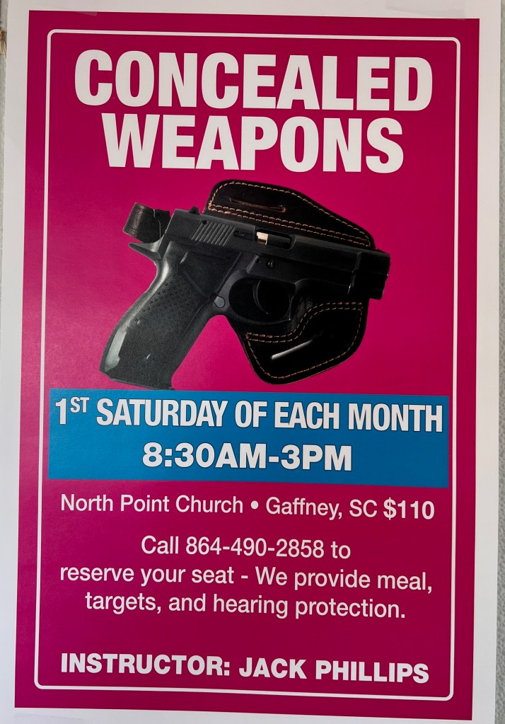 Before we really entered the restaurant, something unexpected happened. David noticed a flier in the entry way. Nothing unusual in that; you expect fliers for local businesses or local school plays in a diner foyer. I personally have never seen one for a concealed carry class. It was the only flier pinned up. And the class is given at the local church, the first Saturday of every month. Why did they only have that poster? Was that because they wanted everyone to know they were carrying? Or they wanted everyone else to carry? I’m still confused. Anyway, no one is going to hold up that restaurant. It’s actually kind of comforting.