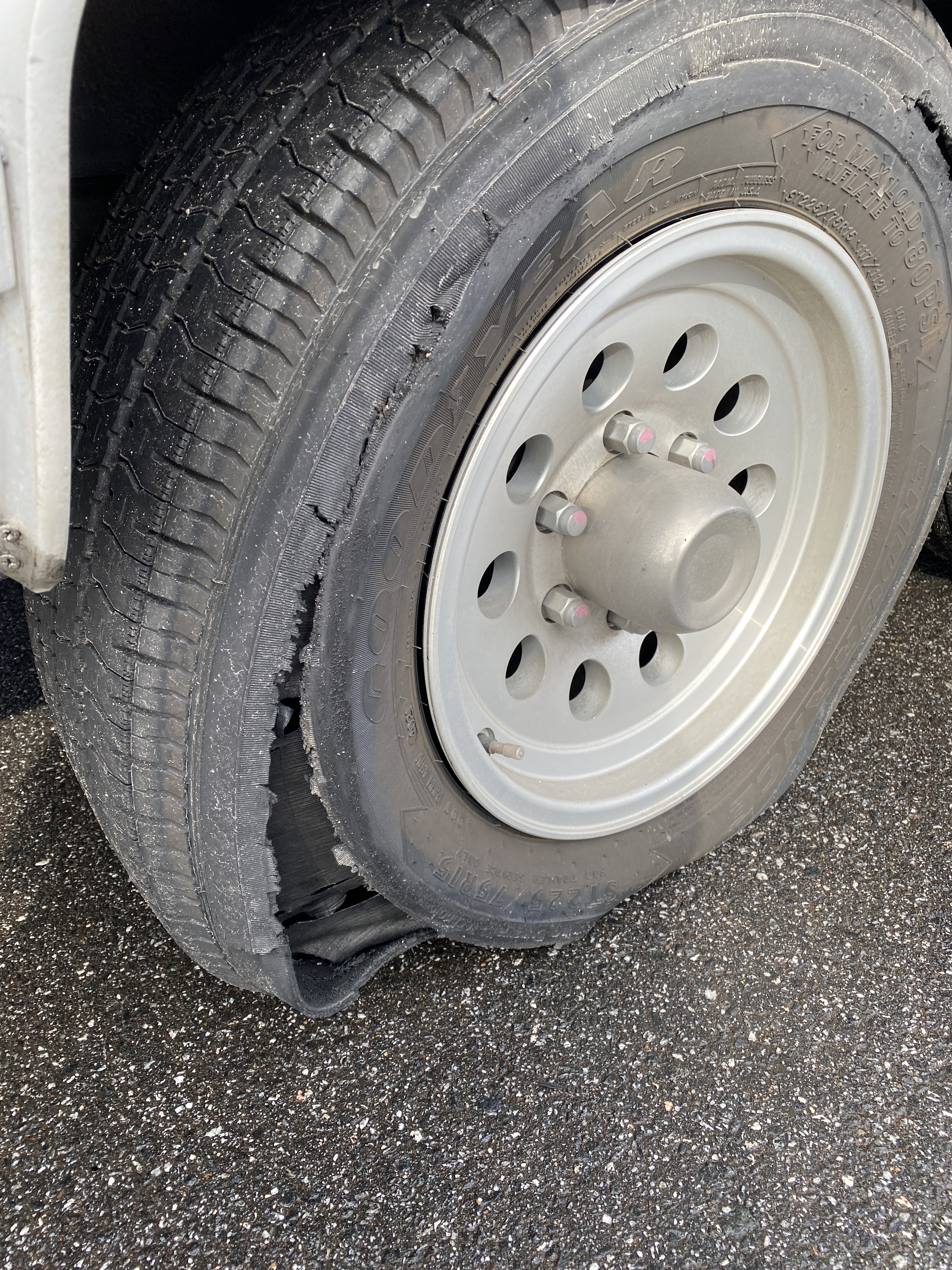 We lived in Manhattan for about 10 years in the late ‘80s/early ‘90s. Commuting to Queens on roads that rival those of a third world country (which exist to this day in the NY Metro area) gave David lots of practice changing tires. Unfortunately, he had to employ those skills again. It didn’t take long to realize that our roadside assistance program was not going to come, so David got to it. He had us out of there in 30 minutes. His Boy Scout mentality has us prepared for every eventuality. We had a special tire changing ramp that works for RVs with 4 tires. Honestly, the hardest part is removing the spare and putting the flat away. We headed home and ordered a pizza.