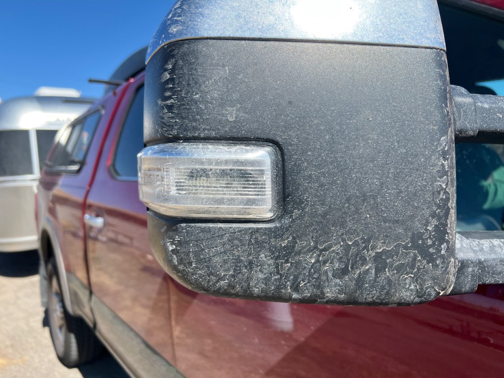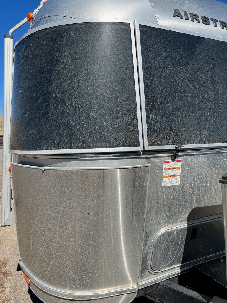 That said, Oklahoma is beautiful country. Arkasas is full of waterways and while Oklahoma has some that, the rolling hills are just beautiful. I could feel “the wind that comes whipping down the plain” lyrics while the trailer was lightly buffeted during the drive. Oklahoma flattens out going west and the sky gets bigger and bigger. The trees don’t grow tall, maybe 15 feet, and they gradually seem to disappear. Then you enter Texas, the part of the Panhandle that I-40 crosses, and everything is just like the bottom of the ocean. Flat flat flat. Cattle farms were more Oklahoma and this part of Texas is wind farms. Miles and miles of 280-foot high white monoliths. Sometimes they are in organized rows and other times, they seem randomized. They are modern man-made dinosaurs towering over everything. The Oklahomans have casinos and the Texans have wind power.