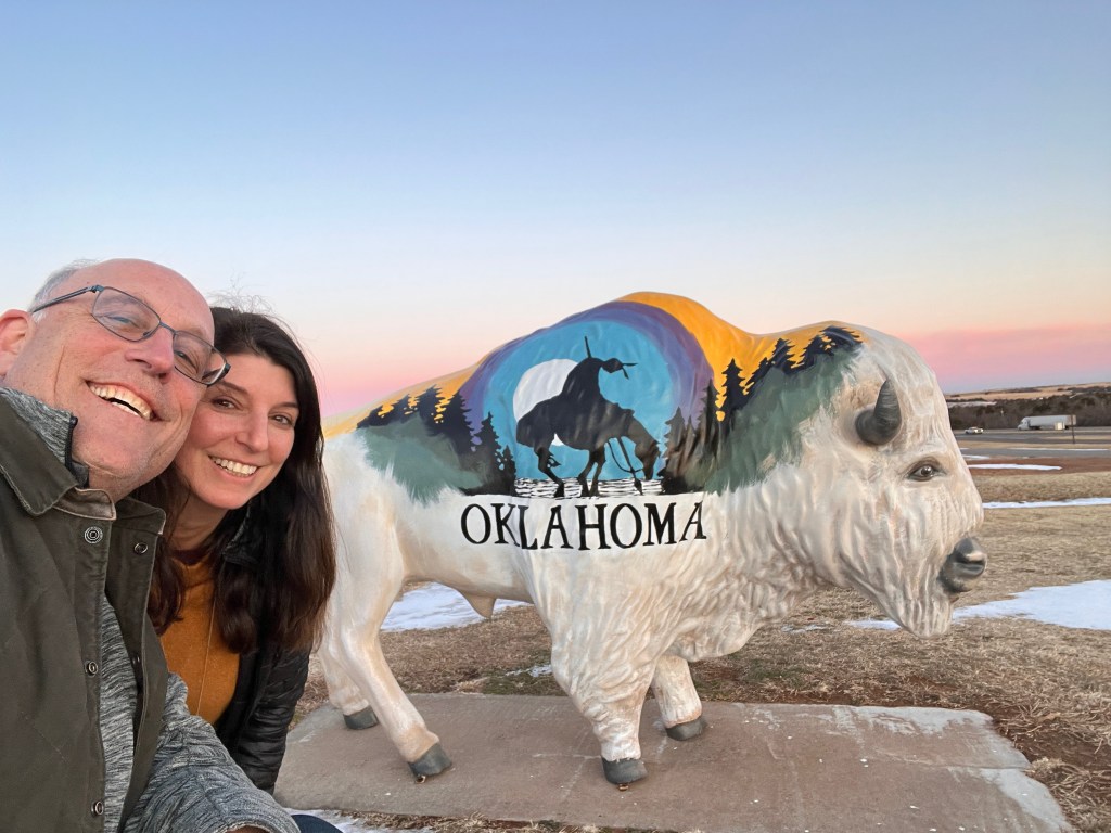 We stopped outside of Oklahoma City in a KOA called Reno West. Not sure it has anything to do with the other Reno, but it did have a Cherokee Trading Post and a pen with two Bison, the state animal. BTW, our rig is filthy after driving through AR where they salted the roads for the upcoming flurries.
