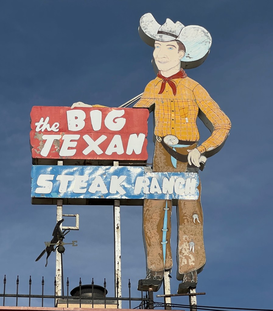 How could we miss something called the Big Texan Steak House? It was a couple miles down the road, and while we could have arrived in style in the complimentary limo complete with longhorn hood ornament, we didn’t want to have to wait for the drop off or pick up times.