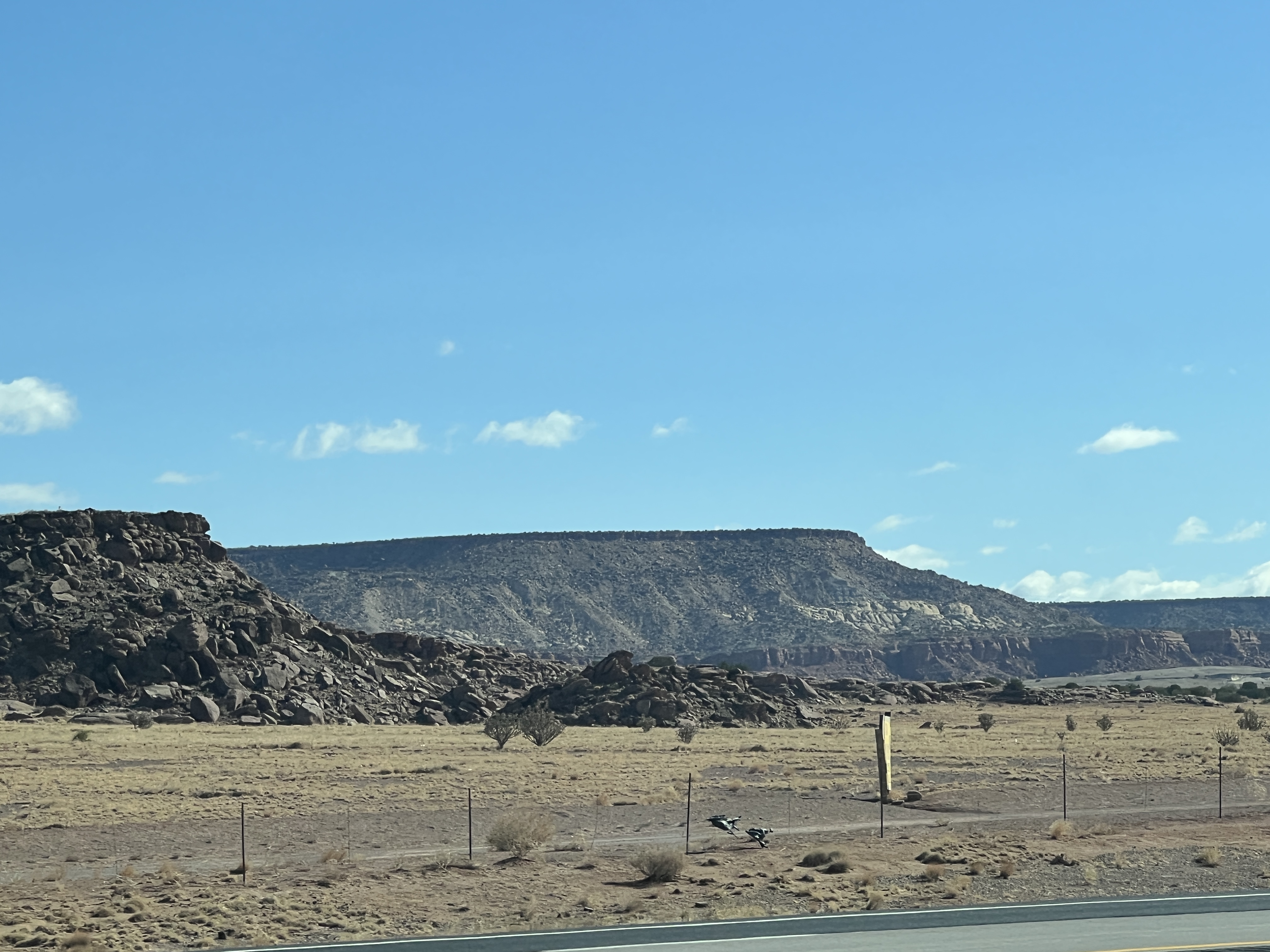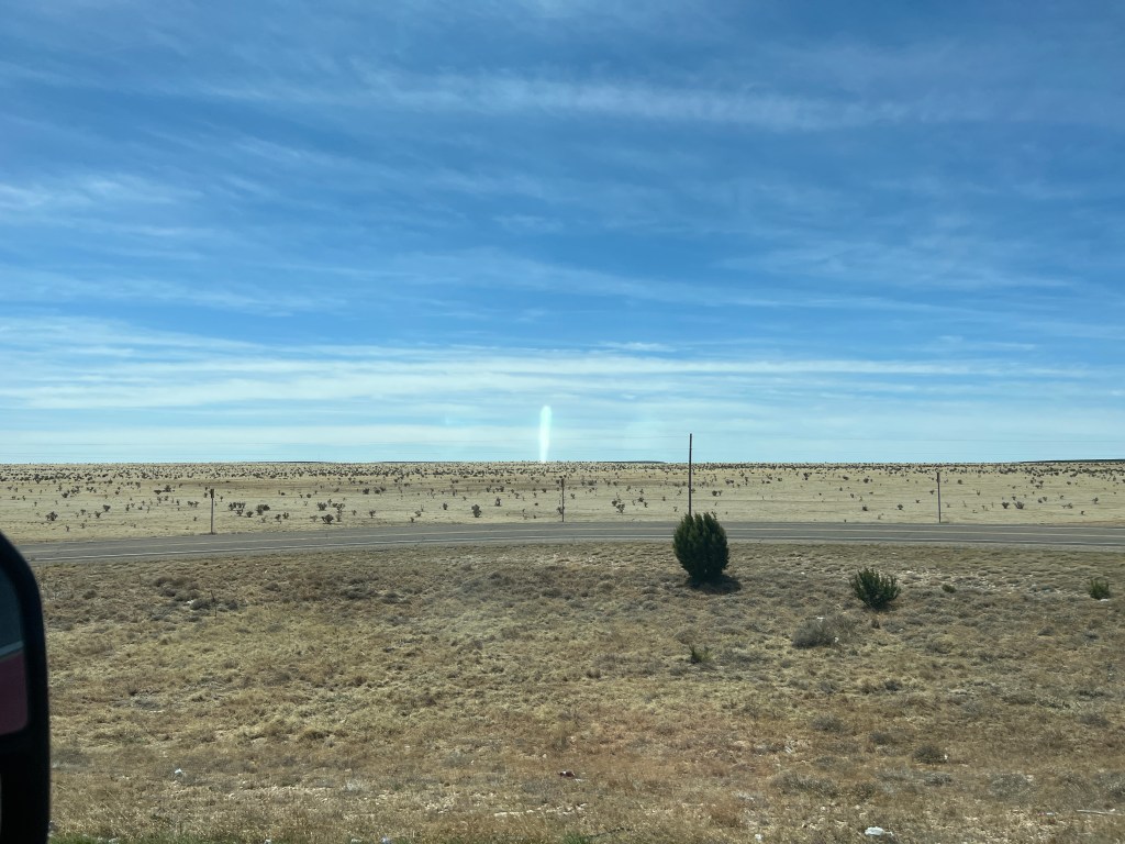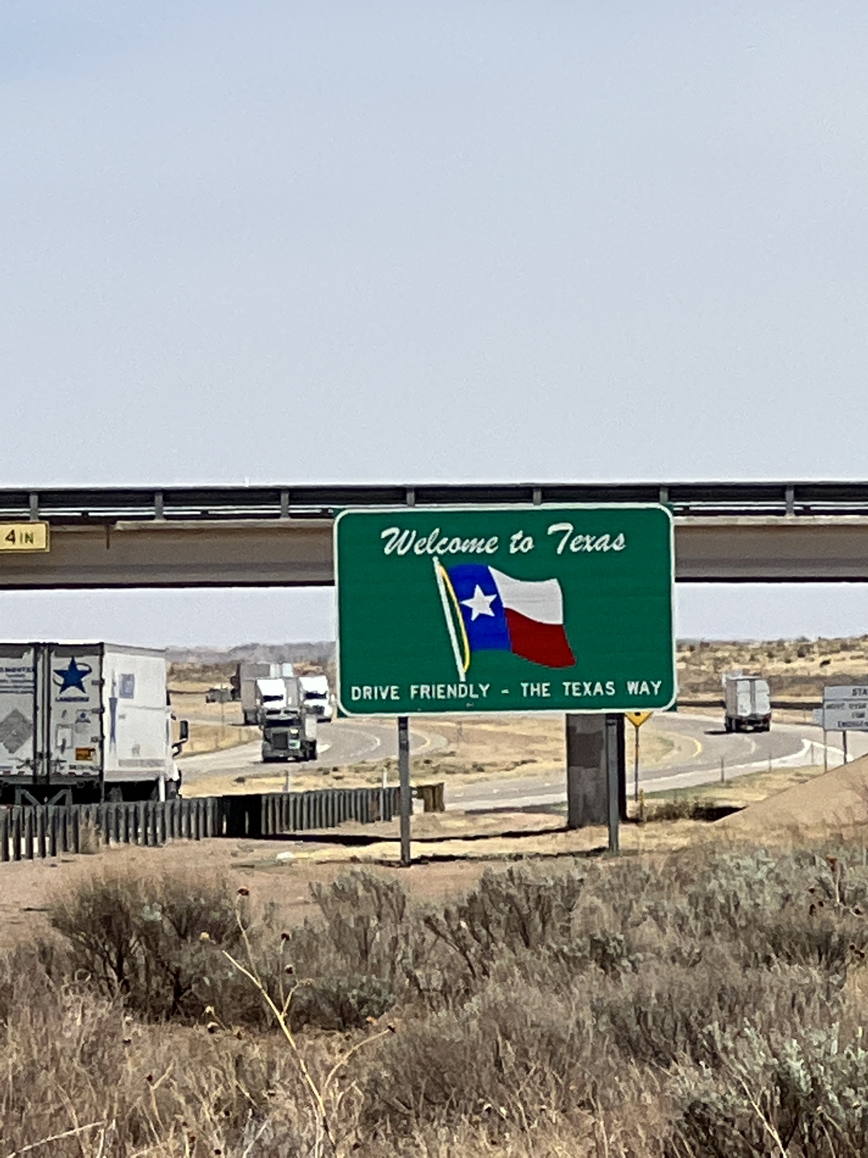 Then New Mexico got flat. The kind of flat where you are sure the horizon will never end. The sky is huge and as the sun makes its ascent, the sky gets lighter and bluer at the same time. If you ever doubt this area of the country was once under the ocean, come drive it. It is flat flat flat. The grass is yellow and dried, dotted with some bushes. Nothing seems to be here, but that is always the mirage of the desert. We know it’s teeming with life, it’s just that we don’t slow down enough to see it. And we were going the 75mph speed limit.