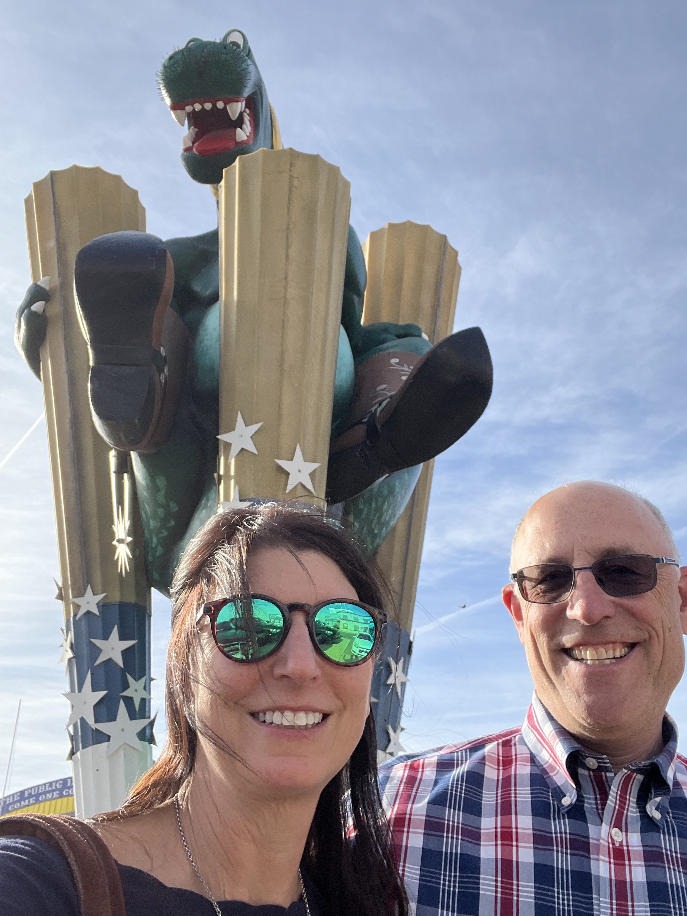 We’re lucky we didn’t. It was a 45 minute wait at the kitschiest place we’ve been to in a while. We enjoyed getting our picture taken with the 20-foot high steer, taking a picture of the 3 story lizard and the colorful attached hotel. Inside there was a shooting gallery, a haunted photo gallery of olde tyme photos (for purchase at the gift shoppe) and their own brews. We tried the bourbon stout because we always do. Nothing to write home about. We realized that we were not interested in trying to eat the 72 oz steak within an hour so it was free. We aren’t even that in love with red meat. Judging by the high-class décor (sarcasm intended) we thought the steak might be the same quality level and finally decided to skip it. I made some Trader Joe’s Indian food at the RV and a salad – a much more satifying choice.