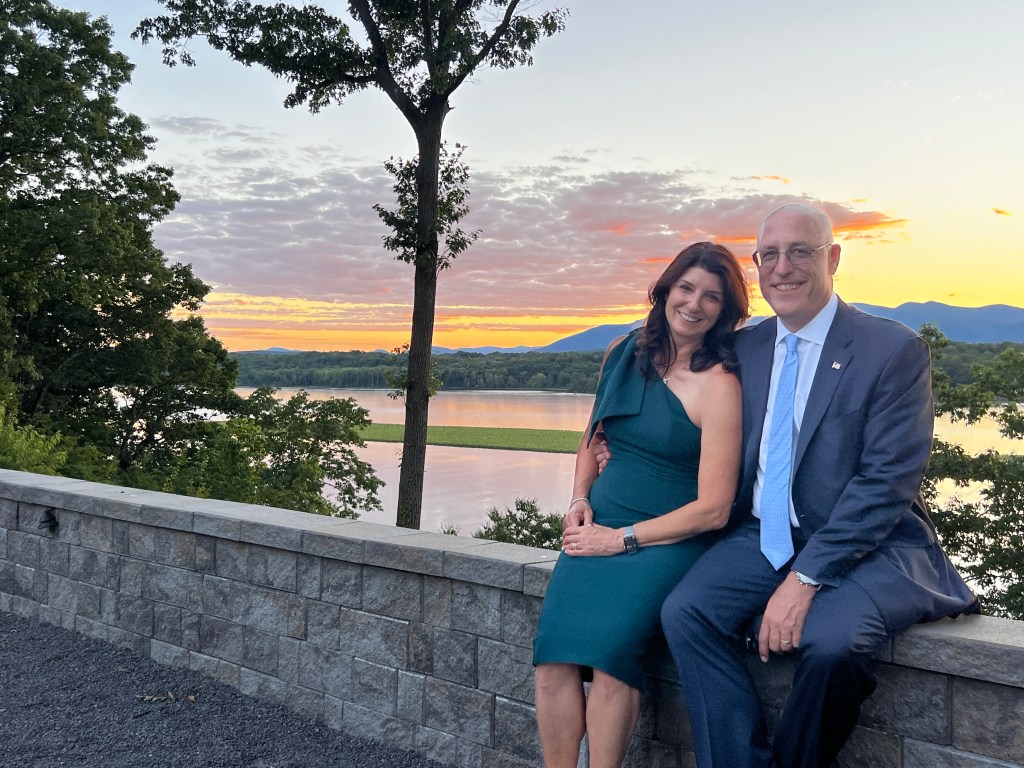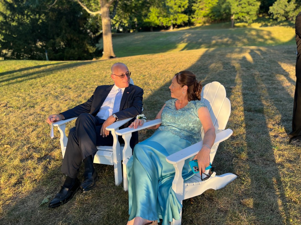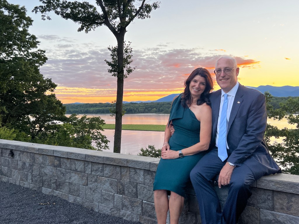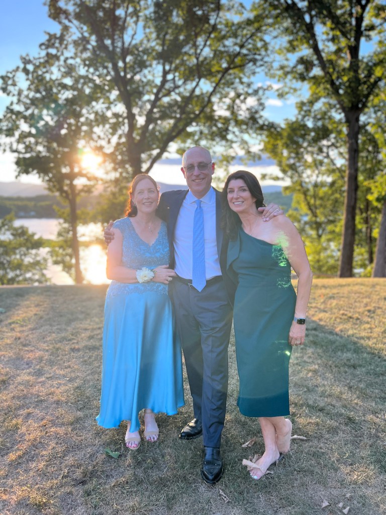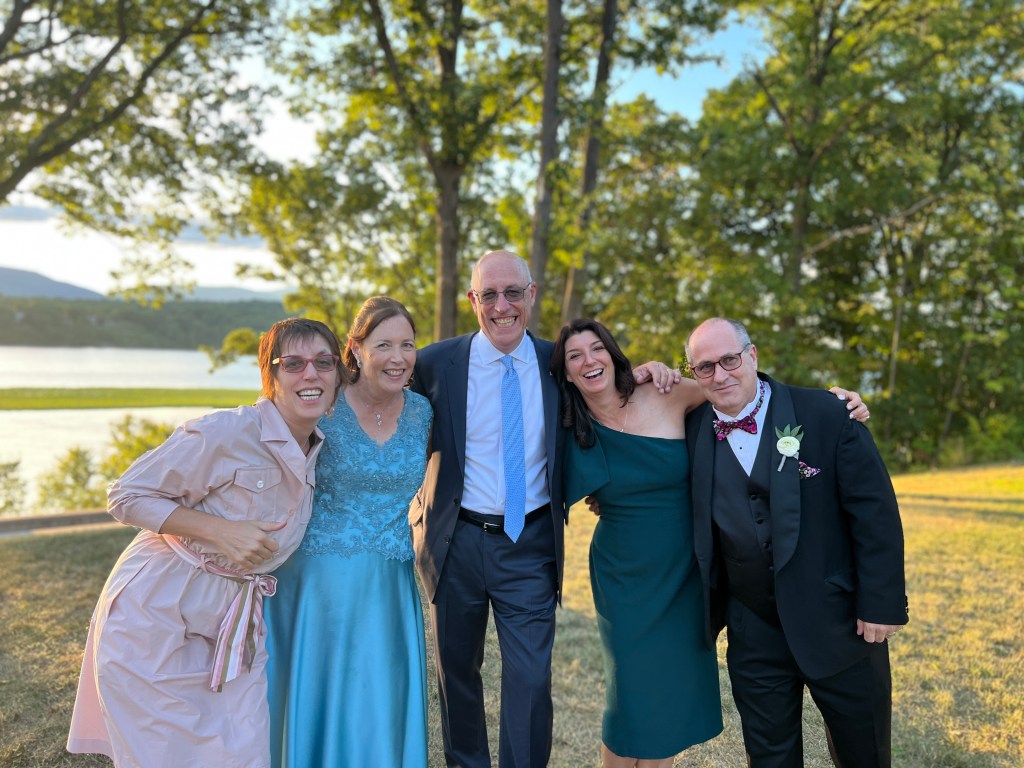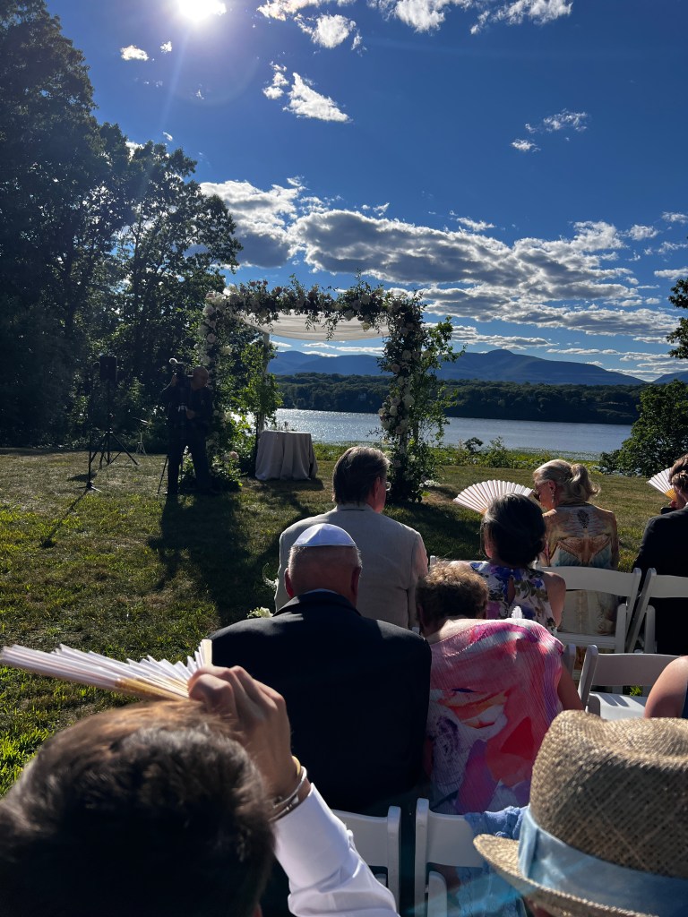 Matt and Patty got married on a private estate in Hudson that was just gorgeous. Period. A couple of hundred acres abutting the Hudson River that was wooded and secluded, but opened up to amazing views. The ceremony backdrop was the sun setting over the mighty Hudson River. The bride looked like a princess. As in the movie 27 Dresses, I looked at my nephew as his bride came up the aisle. He was as radiant as she was, with tears in his eyes. The joy and the love were evidenced everywhere. The band was like nothing I’ve ever heard. They played covers that were even better than the originals. Everyone danced the night away! It was great fun to see the groom’s octogenarian grandparents on the floor at every opportunity. The flowers, the setting, the rising moon, the firepit… it was magical. I wish the newlyweds every joy, health and happiness life can bring them.