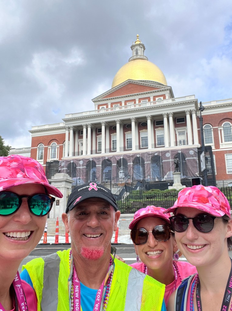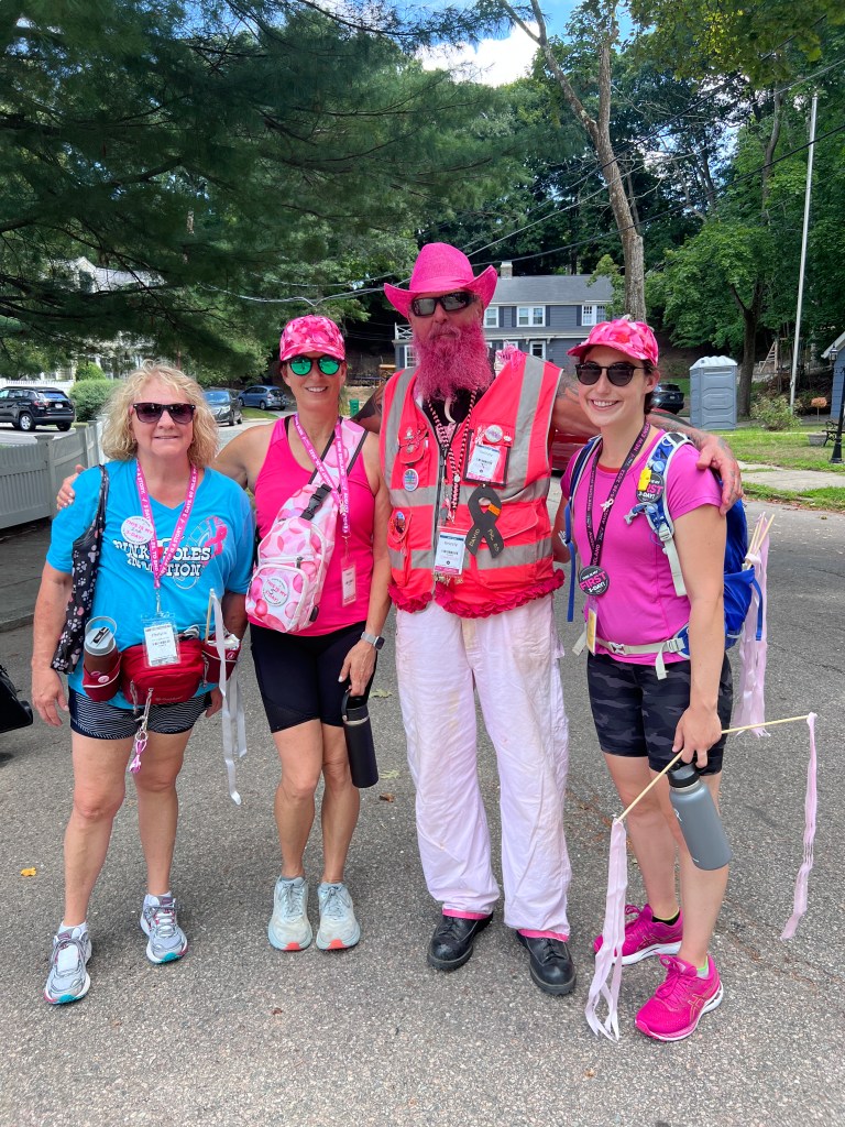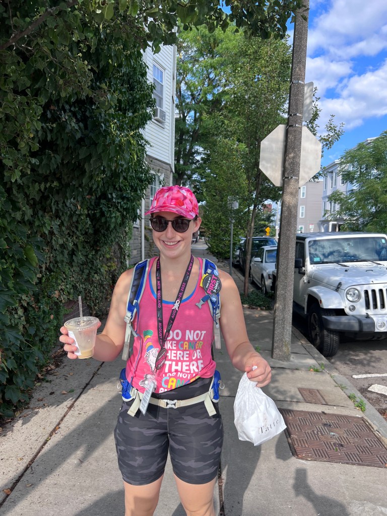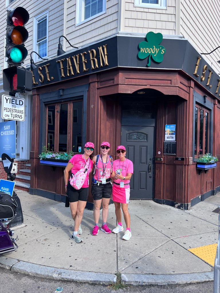 Linda flew in from CA on the red eye on Friday and I met her in the early afternoon. Our room wasn’t ready, but we got a chance to enjoy the “pink bubble” and say hello to some crew members and other walkers. Later, we met Brianna in the North End – the Little Italy of Boston — for dinner. She got us an outdoor table in an area that you could swear was lifted out of Rome. It was a warm, lovely summer night with the sun slowly sinking in the sky. Linda’s college friend joined us and my mom took a cab right from the airport to meet us. To top it off, it was the beginning of their big Italian festival, St. Anthony’s Feast. Mario Puzo would have been proud of the special parade that marched right by our table to the church 100 feet away complete with the brass band and people carrying a Madonna statue, decorated with streamers clipped with cash. Eat your heart out GodFather. We ate our hearts out as the food was delicious. And then we shared cannolis. You might like Mike’s but we went for Modern Pastry’s. Those of you who know, know.