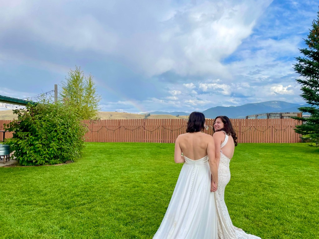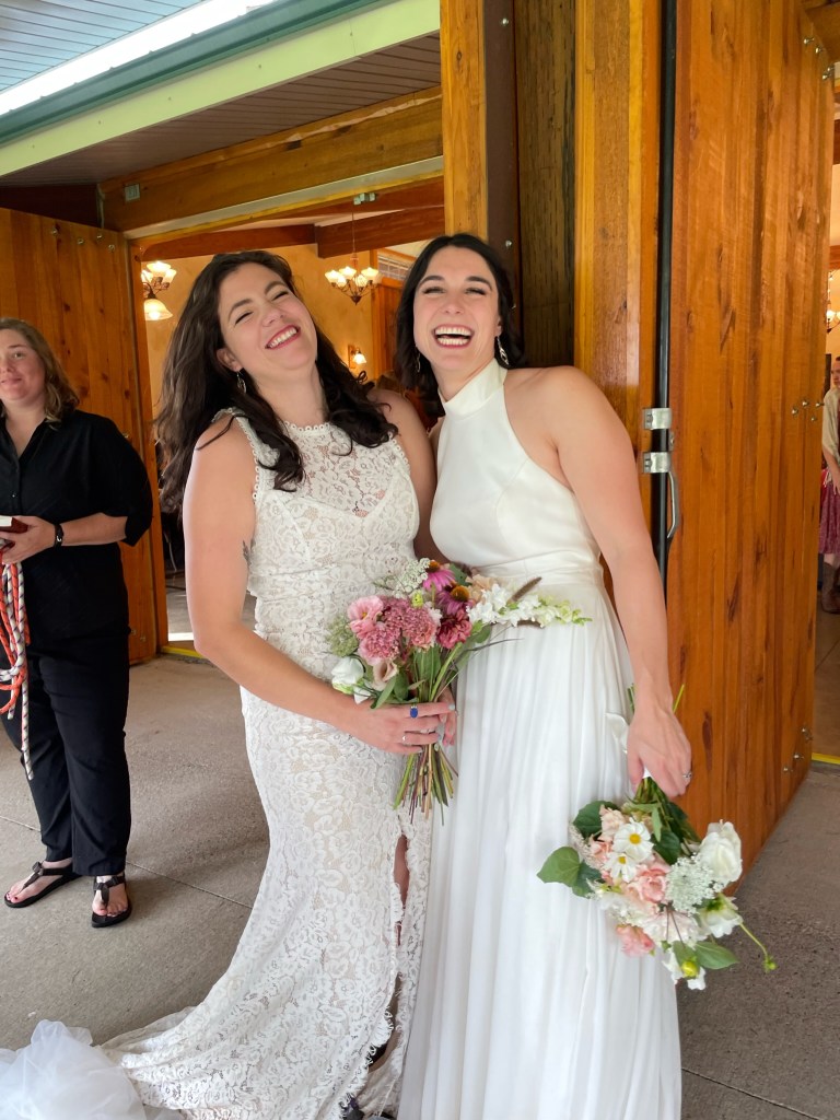 The ceremony was next. The brides’ dear friend Jill officiated. Since Madison and Rachel had already said their vows at their elopement, they had a different kind of ceremony that was very true to their interests. Representing the weaving together of two people into a couple and families coming together, they had two pieces of climbing rope which they first knotted. Then the brides each said something special to her parents and Jill then guided the parents to continue the knot (because we had no idea what we were doing!). It was a truly lovely ceremony. Afterwards, each parent gave a speech to their daughter. Mother Nature had other plans. The sky opened up and we had to make a mad dash to the covering of the wedding venue. It was only a few feet, but everyone found a seat and then we continued the ceremony inside. It was seamless really.