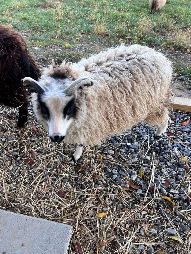 Our sheep look so small without their fleeces. And they look so fragile! Without their coats, and the colder weather coming, we stopped off at the Goodwill store and bought some $4 coats we could get dirty. We cut off the sleeves or bought down vests and wrangled them in. Of course we forgot that they might pee in them if they are in the way…. Learning as we go! We’ll adjust the clothes further tomorrow. Ugh. Or I’ll borrow coats from Amber — At least for a template!