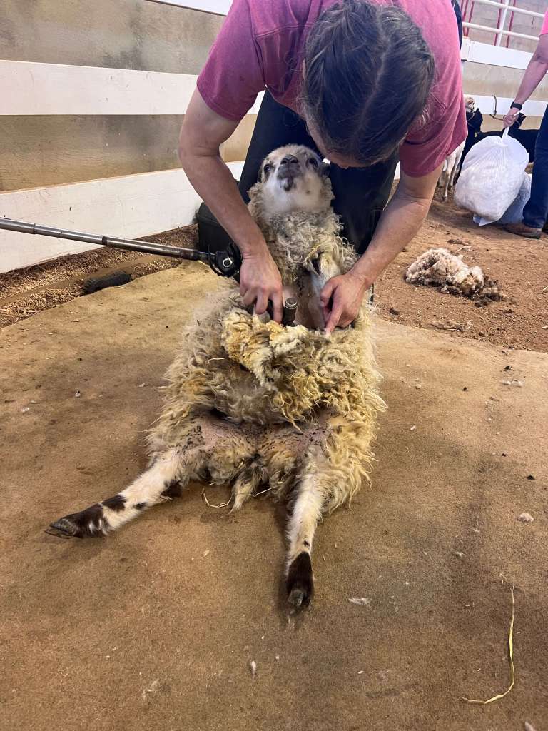 Luckily Amber knows the sheep shearer. This is a hard person to get in with. Everything fell into place though. I got in touch with his assistant who mentioned that they would be giving a live demonstration on Sunday at SAFF. It didn’t take much convincing for David to help me put the sheep in the back of the covered pick up (yep they fit with plenty of room to spare) and drive over to the fairgrounds. Rachel and Madison came too. The shearing was epic. We waited in line with dozens of others and got to watch them shearing angora goats as well as lots of sheep. And then we stopped over to watch the border collie demonstration — as you do.