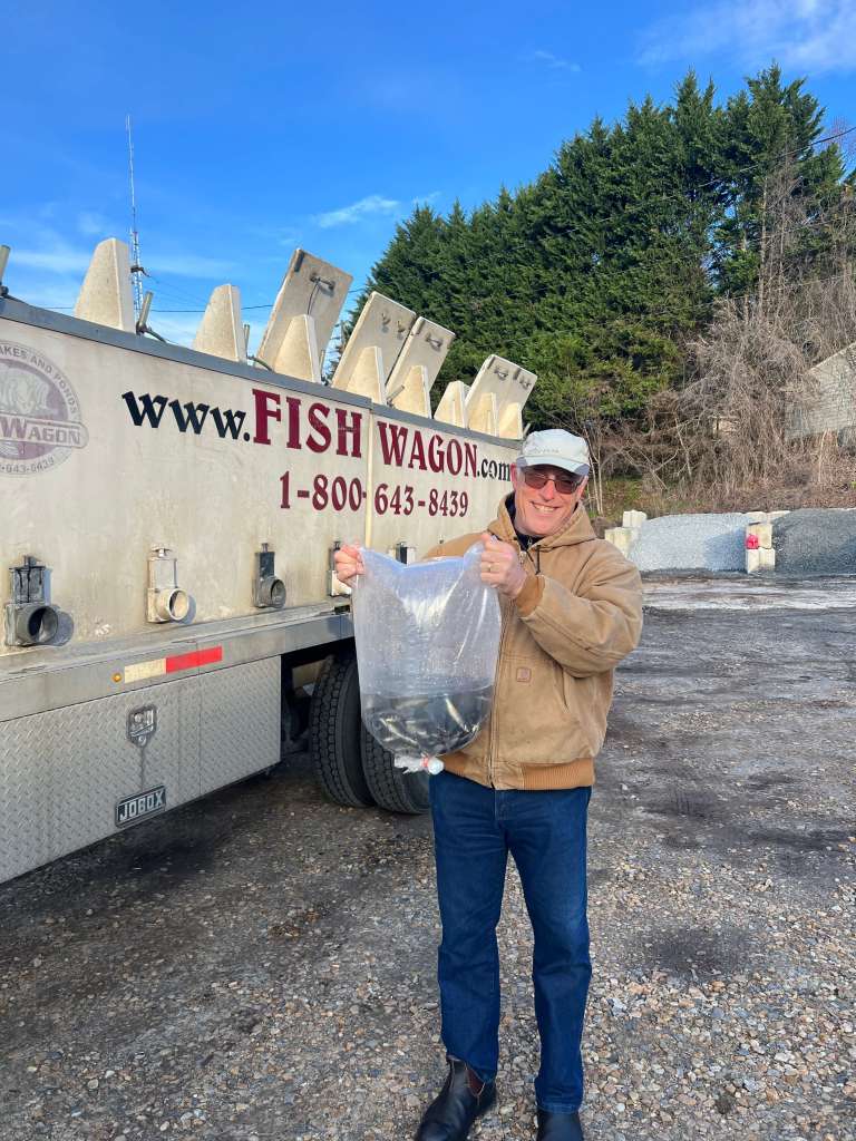 Like everything else here, it may seem that things take care of themselves, but no. Even the ponds need help. To keep down algae, we a completely organic dye to the edges of the pond called Pond Shade, but it’s not enough. We also have fish that clean up the bottom. Some was stocked before we bought the farm, but now it needed replenishing.